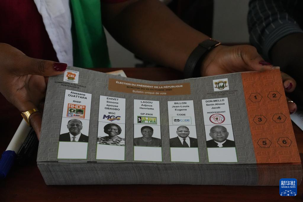 这是10月25日正在科特迪瓦经济首都阿比让一投票坐里拍摄的候选人消息。记者 摄 阿比让10月25日电(记者)科特迪瓦总统选举25日正式拉开帷幕,现任总统阿拉萨内·瓦塔拉将取其他4名候选人展开比赛。